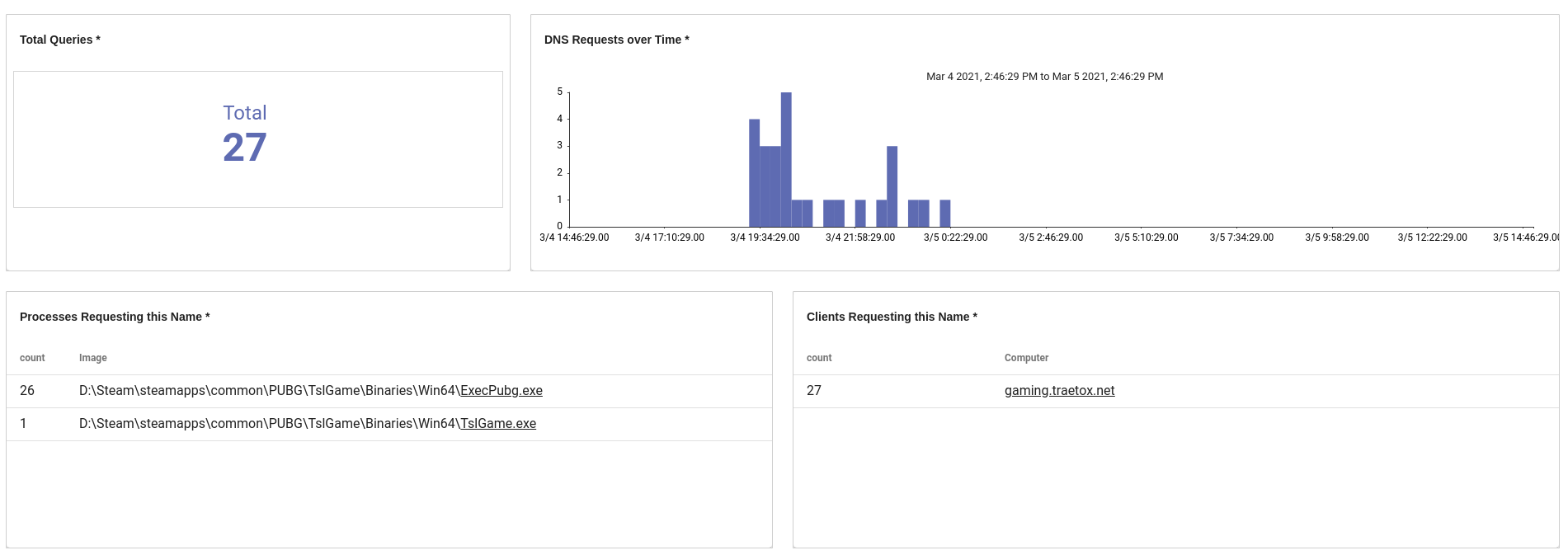 We can see that 26 out of 27 lookups came from ExecPubg.exe, which is clearly PUBG, but there's another application, TslGame.exe, which queried the hostname once. Lets click on that application name and see what it has been doing with the Process Investigation dashboard.