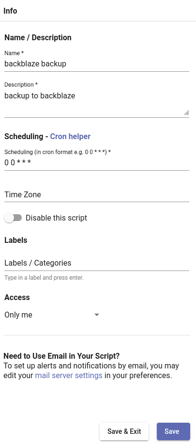 Then create a new script and populate the description and the schedule; the default, running nightly, is a good choice: