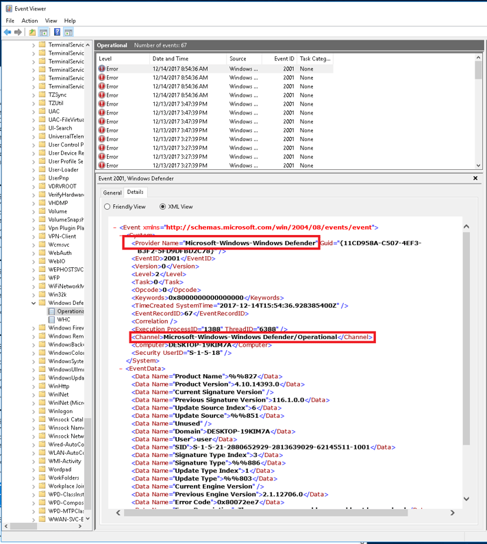 We are monitoring the Operational channel for Windows Defender, but there is also a WHC channel which provides mostly informational events about the state of the Windows Defender process. An important point on Windows event channels, providers, and the like, is that there are a lot of them and it may not be immediately obvious how a log is generated and what configuration parameters you will need in order to get it. My handy dandy cheat is to just open up Event Viewer, find a log entry I care about, and pull the provider, channel, and source directly from the XML; it's just easier.