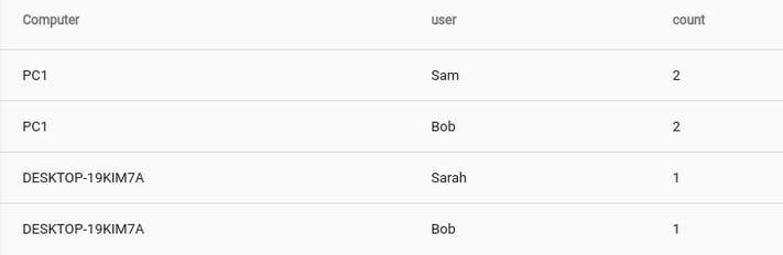 The most basic query for tracking successful logons is to simply count using the username and computer keys, giving a table of the number of times each user logged into each machine in a sorted list. This isn't a query that one would use on a regular basis, but it shows the structure of the log entry and prepares us for dong other more interesting things.