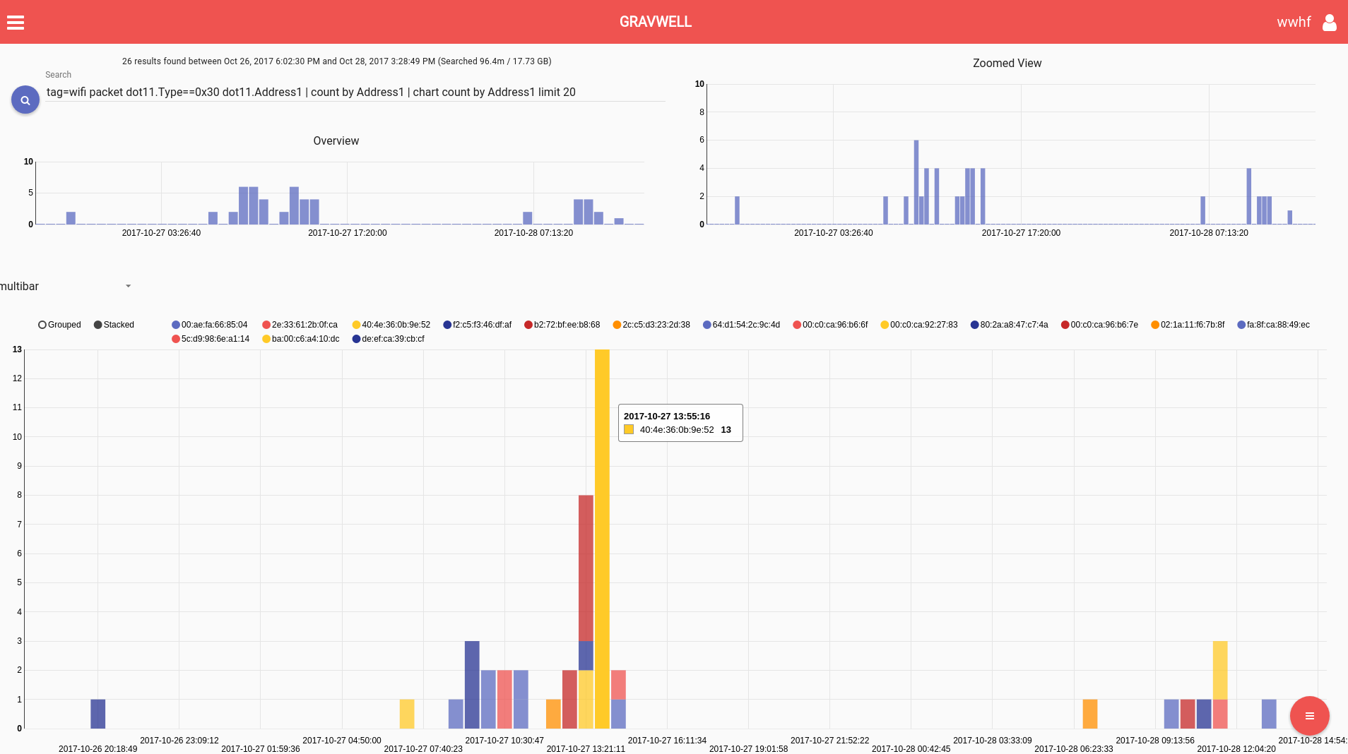 Using Gravwell, we can go back in time and always have access to the underlying data. During the event we had a dashboard actively running showing us what was going on. Here’s a screenshot of the FDG zoomed in on a smaller period of time. You can see the MAC address in the middle belonging to the winner of the contest. The lines demonstrate his progress as he spent time on each WWHF-LAB access point to finish the challenges.
